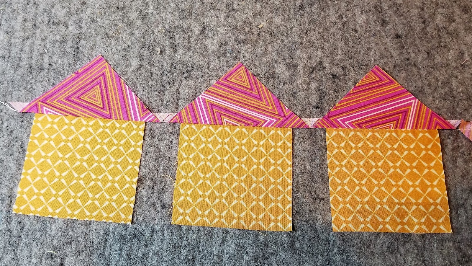 Stitch the (M2) Side Triangles to the remaining sides of all the Center Squares and press seams toward the Side Triangle.